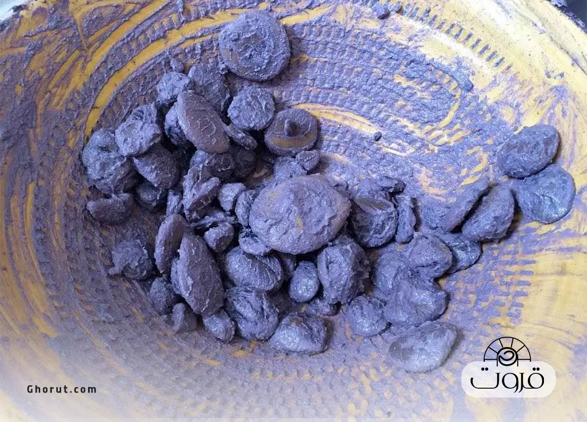 2. سپس قوروتها را همراه با گردوی آسیاب شده و نمک داخل ظرف مناسبی (معمولاً ظرف سفالی یا گِردی که به آن «تقارچه» گفته میشود) میریزیم و آنقدر میساییم تا خوب مخلوط و سابیده شوند.